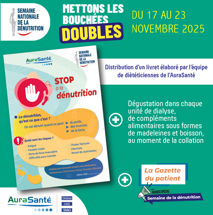 📣 𝗟'𝗔𝘂𝗿𝗮𝗦𝗮𝗻𝘁é 𝗽𝗮𝗿𝘁𝗶𝗰𝗶𝗽𝗲 comme depuis plusieurs années à 𝗹𝗮 𝗦𝗲𝗺𝗮𝗶𝗻𝗲 𝗡𝗮𝘁𝗶𝗼𝗻𝗮𝗹𝗲 𝗱𝗲 𝗹𝗮 𝗗é𝗻𝘂𝘁𝗿𝗶𝘁𝗶𝗼𝗻 𝗱𝘂 17 𝗮𝘂 23 𝗻𝗼𝘃𝗲𝗺𝗯𝗿𝗲 2025. Durant cette semaine, un flyer de sensibilisation à la dénutrition élaboré par l’équipe de diététiciennes de l’AuraSanté (pôle MRC et Domicile), sera distribué sur nos unités de dialyse ainsi qu’aux patients pris en charge sur le Pôle Domicile (HAD - SSIAD).