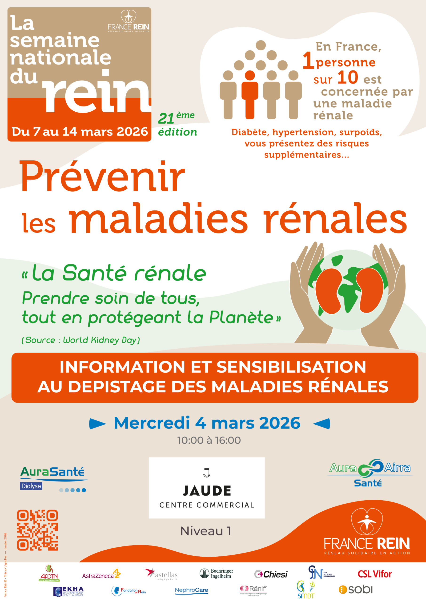 👉 Objectif : informer, sensibiliser et donner les clés pour protéger vos reins au quotidien. Inciter également à se faire dépister gratuitement et anonymement sur différents sites (établissements de santé) la semaine suivante. La liste sera communiquée lors de cette journée du 4 mars 2026.