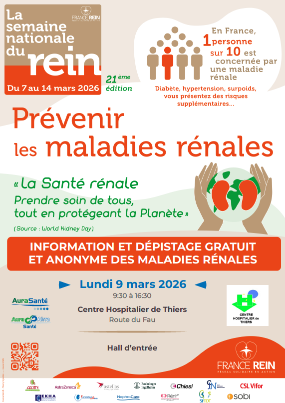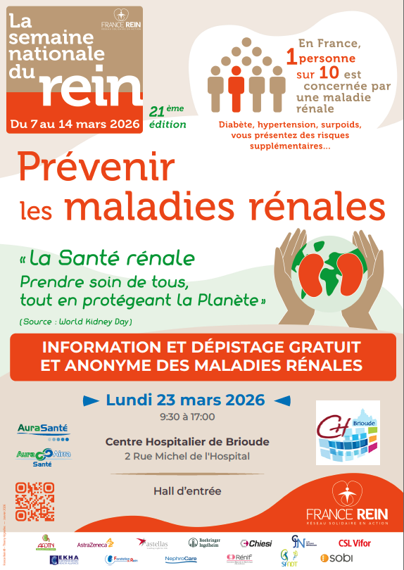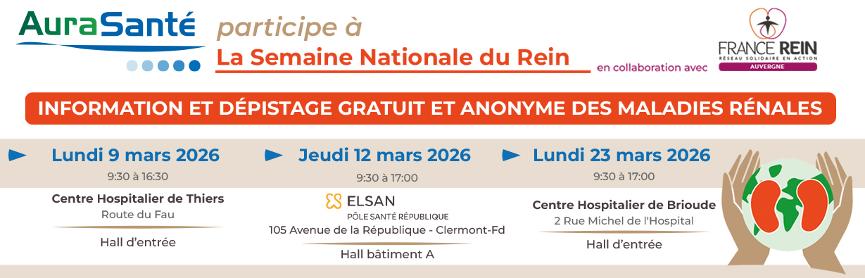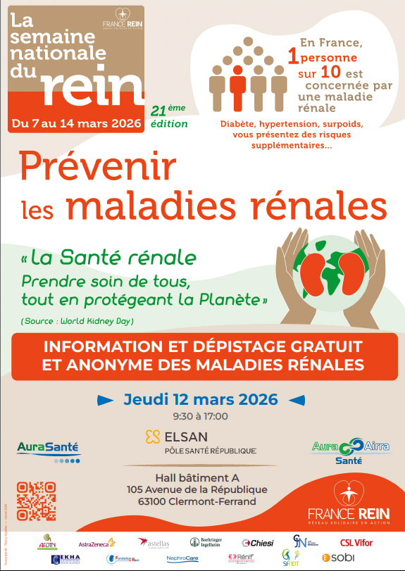 📣 L’AuraSanté en collaboration avec France Rein Auvergne, vous propose de participer à des journées d'informations et de dépistage gratuit et anonyme des maladies rénales :